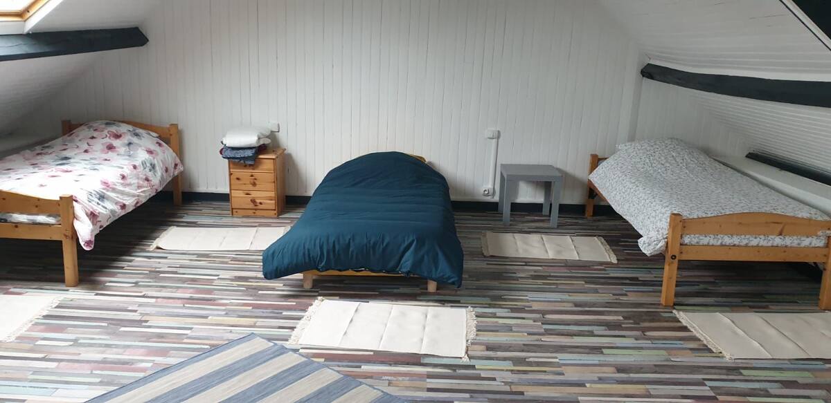 2e étage : Dortoir mansardé avec 3 lits simples (90×190), accessible par un escalier de meunier (déconseillé aux jeunes enfants).